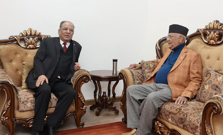 काठमाडौँ – प्रधानमन्त्री पुष्पकमल दाहाल प्रचण्ड र प्रमुख प्रतिपक्षी दल नेकपा एमालेका अध्यक्ष केपी शर्मा ओलीबीच शान्ति प्रक्रियाका काम चाँडो टुंग्याउने विषयमा छलफल भएको छ ।