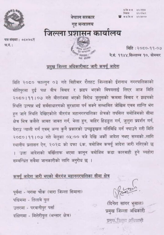 पूर्वमा बाराको सिमाना जोडिएको नगवा चौक, पश्चिममा तिलावे पुल, उत्तरमा परवानीपुर र दक्षिणमा मितेरी पुल भन्सारसम्मको क्षेत्रमा अनिश्चितकालका लागि कर्फ्यू आदेश जारी भएको हो ।