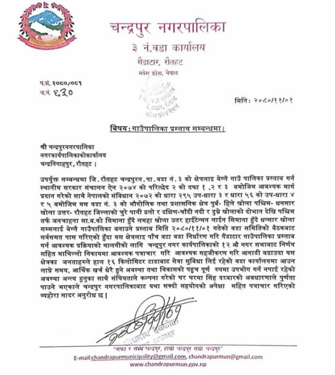 काठमाडौँ – रौतहटको चन्द्रपुर नगरपालिकाको नगरसभाले वडा नम्बर ३ लाई छुट्टै स्थानीय तह बनाउने निर्णय गरेको छ ।