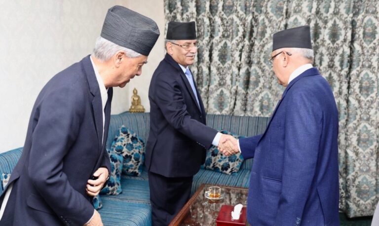 काठमाडौं । पेचिलो बनेको राष्ट्रिय सभा अध्यक्षको निर्वाचन र नयाँ समीकरणको चर्चाले दलहरुको दौडधूप बढेको छ । आज बिहानै प्रधानमन्त्री पुष्पकमल दाहाल प्रचण्ड, एमाले अध्यक्ष केपी शर्मा ओली र कांग्रेस सभापति शेरबहादुर देउवाबीच भेटवार्ता भएको छ ।