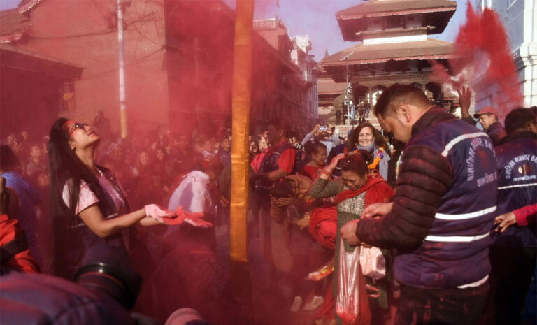 काठमाडौँ— काठमाडौंको बसन्तपुरमा रङ्गीचङ्गी ध्वजाले सजाइएको तीनतले चीर ठड्याइएको छ । यससँगै रङ्गहरुको पर्व होली सुरु भएको छ ।