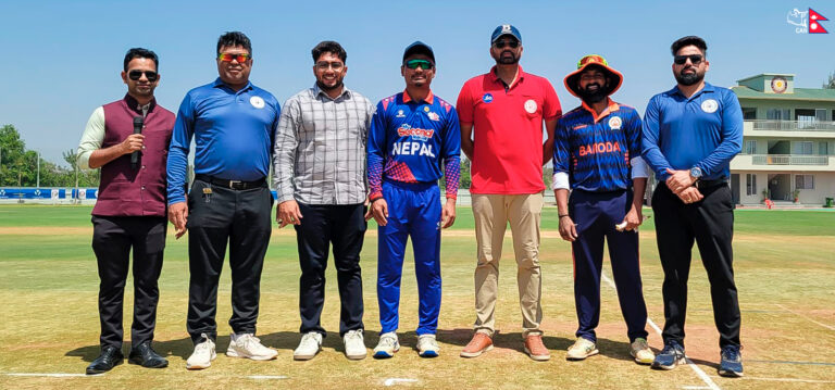 काठमाडौँ— भारत भ्रमणमा रहेको नेपालले त्रिकोणात्मक टी-२० सिरिजअन्तर्गत आफ्नो दोस्रो खेलमा बरोडासँग टस हारेर पहिला ब्याटिङको निम्तो पाएको छ ।