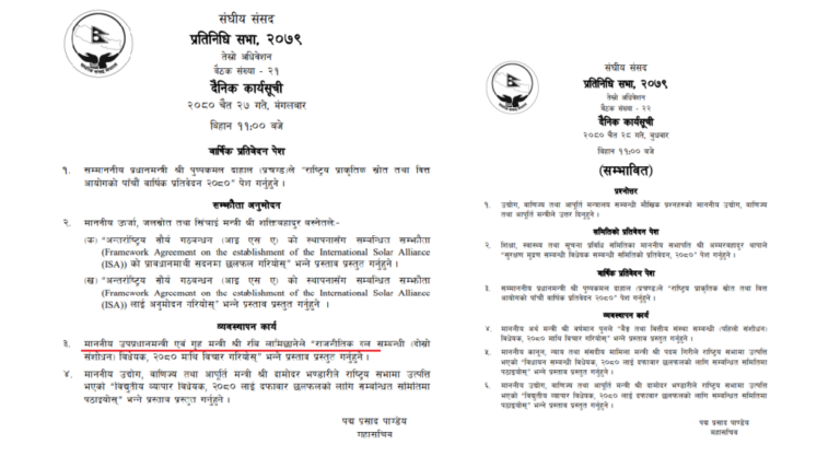 काठमाडौँ – उपप्रधान तथा गृहमन्त्री रवि लामिछानेले प्रतिनिधि सभाको बैठकमा प्रस्तुत गर्ने तय भएको विषय कार्यसूचीबाट हटेको छ ।