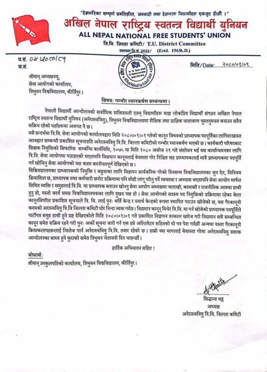 काठमाडौं । त्रिभुवन विश्वविद्यालय सेवा आयोगले कार्यविधि विपरीत प्राध्यापक पदपूर्ति गर्न खोजेको भन्दै नेकपा एमालेको विद्यार्थी संगठन अनेरास्ववियुले आपत्ति जनाएको छ ।