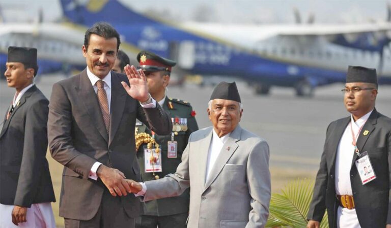काठमाडौँ— कतारका अमिर शेख तमिम बिन हमाद अल थानी नेपाल आएका छन् । दुईदिने नेपाल भ्रमणका निम्ति आज नेपाल आइपुगेका हुन् । उनलाई नेपालका राष्ट्रपति रामचन्द्र पौडेलले त्रिभुवन अन्तर्राष्ट्रिय विमानस्थलमा स्वागत गरेका छन् ।