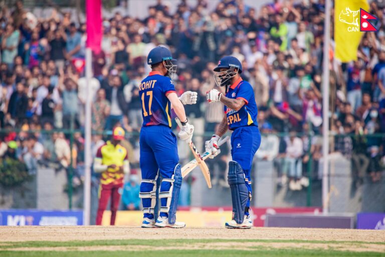 नेपालले ११ ओभरमा ३ विकेट गुमाउँदै ९६ रन बनाएको छ । रोहित पौडेल २९ बलमा ६ चौका र २ छक्कासहित ५३ र दीपेन्द्र १ रनमा क्रिजमा छन् । ओपनर अनिल शाह ५ र कुशल मल्ल र कुशल भुर्तेल १६-१६ रनमा आउट भए ।