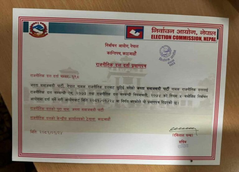 निर्वाचन आयोगको सोमबार बसेको बैठकले जनता समाजवादी पार्टी (जसपा) नेपालबाट विभाजित भई गठन भएको जनता समाजवादी पार्टीको दर्ता भएको हो ।