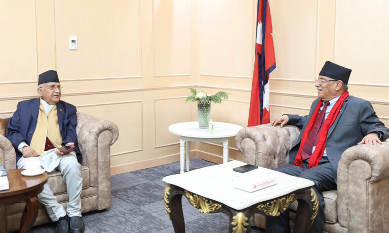 काठमाडौं । प्रधानमन्त्री पुष्पकमल दाहाल ‘प्रचण्ड’ र नेकपा एमालेका अध्यक्ष केपी शर्मा ओलीबीच भेटघाट भएको छ ।