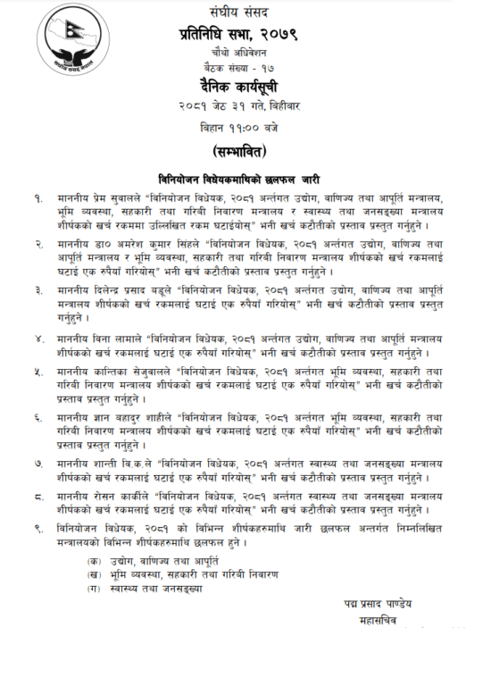 संसद् सचिवालयले जारी गरेको सम्भावित कार्यसूची अन्तर्गत आज उद्योग, वाणिज्य तथा आपूर्ति, भूमि व्यवस्था, सहकारी तथा गरिबी निवारण र स्वास्थ्य तथा जनसङ्ख्या मन्त्रालयसम्बन्धी विनियोजन शीर्षकमाथि छलफल हुनेछ ।