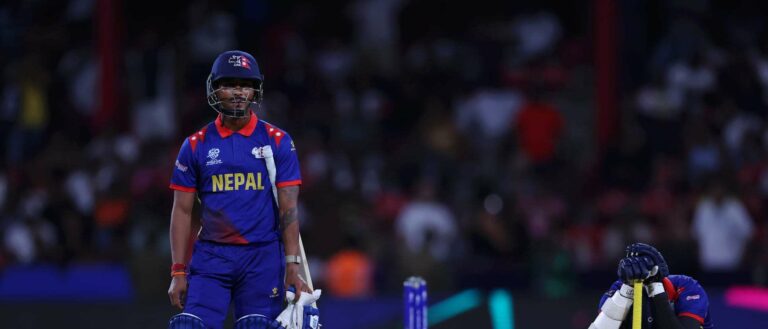 काठमाडौँ – नेपाल आईसीसी टी–२० विश्वकप २०२४ मा उपाधि दौडबाट बाहिरिएको छ । अमेरिका र वेष्टइण्डिजमा जारी टी(२० विश्वकपमा समूह डी मा रहेको नेपाल दक्षिण अफ्रिकासँग १ रनले पराजित भएसँगै सुपर-८ यात्राबाट बाहिरिएको हो । नेपाल समूह डी मा ३ खेलमा २ मा हार र १ मा नतिजा विहीन हुँदै १ अंकका साथ चौथो स्थानमा छ ।अन्तिम खेल नेपालले आइतबार बंगलादेशसँग खेल्नेछ । उक्त खेल जितेपनि ३ अंक मात्रै हुन्छ । सुपर-८ मा पुग्न ३ अंक पर्याप्त हुँदैन ।