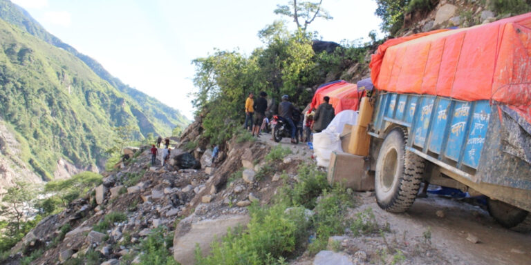 काठमाडौँ— कर्णाली राजमार्ग दुई दिनदेखि अवरुद्ध हुँदा यात्रु अलपत्र परेका छन् । शुक्रबारदेखि परेको अविरल वर्षाका कारण पहिरो जाँदा अवरुद्ध राजमार्ग अझै सञ्चालनमा आउन सकेको छैन । राजमार्गको कालीकोट खण्डमा तीन ठाउँमा गएको पहिरो पन्छाउन बाँकी रहेकाले आज बिहानसम्म पनि राजमार्ग सञ्चालन हुन सकेको छैन । राजमार्गको दैलेख खण्डमा अवरुद्ध भएको सड्क भने सञ्चालनमा आइसकेको कर्णाली प्रदेश प्रहरीले जनाएको छ ।