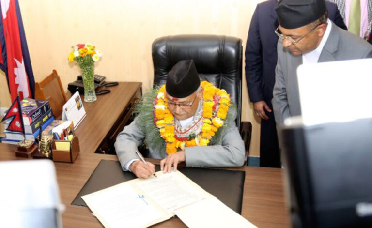 काठमाडौँ— नवनियुक्त प्रधानमन्त्री केपी शर्मा ओलीले पदभार ग्रहण गरेका छन् । आज पद तथा गोपनीयताको शपथग्रहणसँगै सिंहदरबार पुगेर उनले प्रधानमन्त्री तथा मन्त्रिपरिषद् कार्यालयको पदभार ग्रहण गरेका हुन् ।