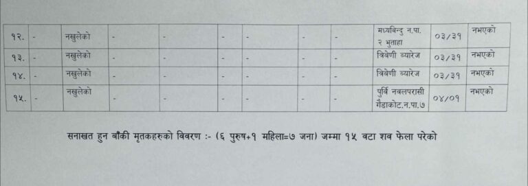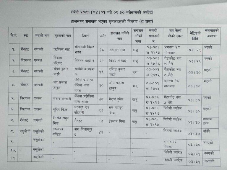 काठमाडौँ – गत शुक्रबार बिहान पहिरोले बगाएर त्रिशूलीमा बेपत्ता भएका दुईवटा बसका यात्रुमध्ये १५ जनाको शव फेला परेको छ । भेटिएका शवमध्ये ८ जनाको परिचय खुलेको सशस्त्र प्रहरीले जानकारी दिएको छ ।