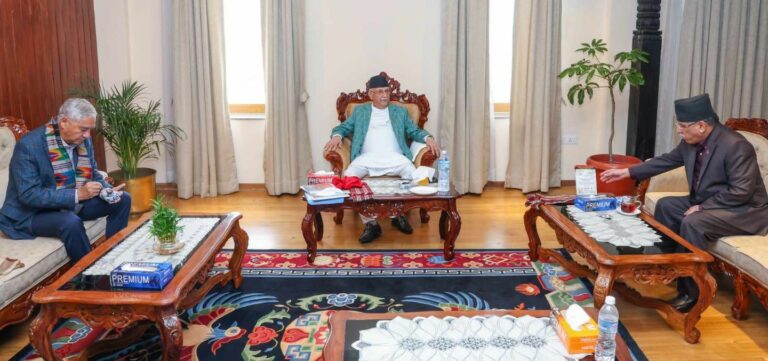 काठमाडौँ— प्रधानमन्त्री केपी शर्मा ओलीको आह्वानमा प्रमुख तीन दलका शीर्ष नेताहरुको बैठक बसिरहेको छ ।