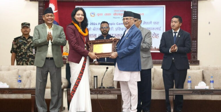 काठमाडौँ – सरकारले पेरिस पारालिम्पिक्समा कांस्य पदक विजेता पलेशा गोवर्द्धनलाई सरकारले ६५ लाख नगदसहित सम्मान गरेको छ। प्रधानमन्त्रीको सरकारी निवास बालवाटारमा आयोजित एक कार्यक्रमकाबीच पलेशालाई सम्मान गरिएको हो। त्यस्तै, खेल प्रशिक्षक कविराज नेगीलाई ५ लाख ८५ हजार र टीम व्यवस्थापकलाई २ लाख ९२ हजार रुपैयाँ पुरस्कारसहित सम्मान गरिएको छ।