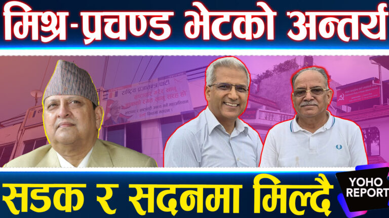 माओवादीकै कारण राजतन्त्र गएको राप्रपाको ठम्याई छ । त्यसैले राजावादीले प्रचण्डलाई आफ्नो स्थायी शत्रु नै मात्रे गर्छ छ । माओवादीले राप्रपाको अस्तित्व सकिदिएको र अब कांग्रेस एमाले मिलेर माओवादीकै अस्तित्व सक्न लागि पर्दा माओवादी झस्किएकै छ । मिश्रसँगको भेटमा प्रचण्डले राजाकै पालामा विकासको मोडेल देखिएको र आवश्यक परे राजासँगै पनि मिल्नुपर्ने पक्षमा बिगतदेखि नै आफू सकारात्मक रहेको बिषय भने अर्थपूर्ण छ । बाइट…डा.प्रमोद अर्याल, राजनीतिक विश्लेषक