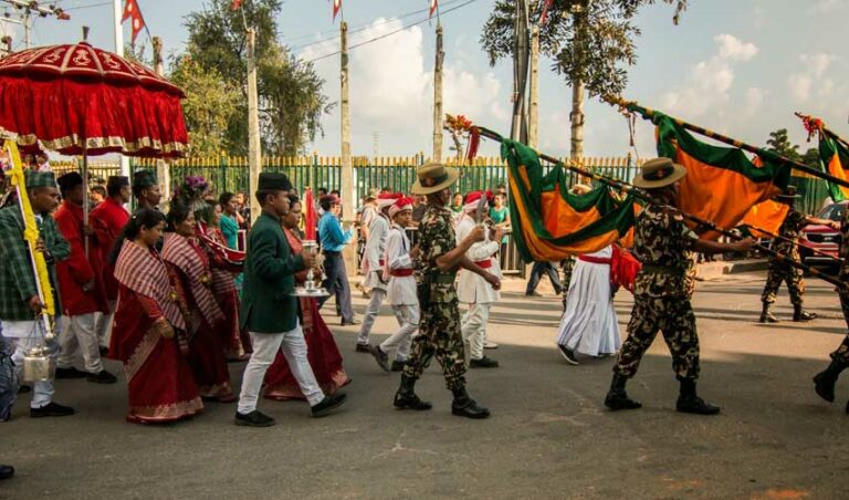 जमलबाट हनुमानढोकासम्म निजामती सेवाका उच्च पदस्थ अधिकारी, गुर्जुका पल्टन, ब्याण्डबाजा, पञ्चेबाजा र सांस्कृतिक नाचगानसहितको लावालस्करका साथमा फूलपाती ल्याउने गरिएको छ ।