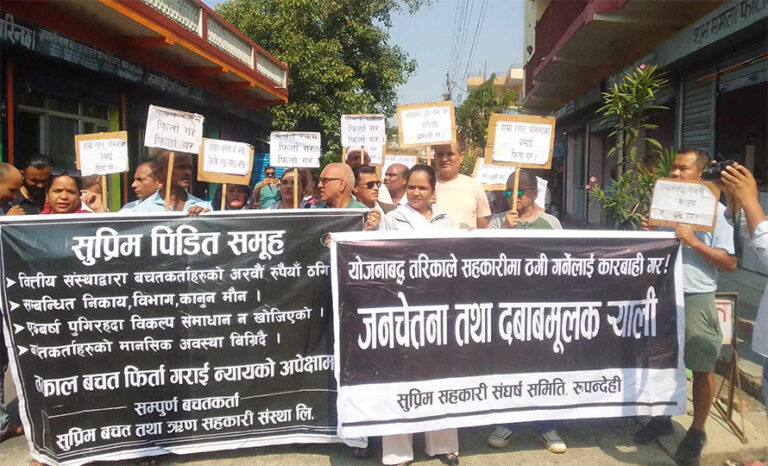 वचतकर्ताको निक्षेप फिर्ता र दोषीलाई कडा कारवाहीको माग गर्दै प्रदर्शन गरिएको सुप्रिम सहकारी पीडित संघर्ष समितिका संयोजक विजय नेपालले बताए ।