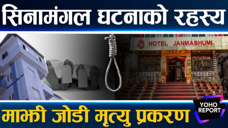 काठमाडौंको सिनामंगलमा रहेको होटल जन्मभूमिमा एक दम्पतीको रहस्यमय मृत्यु भएको छ । शनिवार साँझ क्यानडादेखि नेपाल आएका दम्पती आइतबार बिहान होटलको कोठा बाहिरको बार्दलीमा हरियोरंगकोडोरीमा दुवै झुण्डिएको अवस्थामा भेटिएका थिए । घटनास्थल पुगेको प्रहरीले आवश्यक अनुसन्धान गरी मृतकको शवलाई पोष्टमार्टमका लागि त्रिवि शिक्षण अस्पताललगेको छ ।