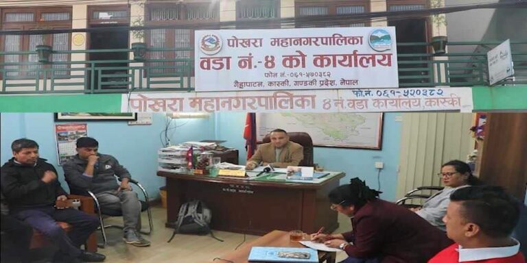 नीतिप्रेस डट कमका प्रतिनिधि सोमबार दिउसो पोखरा महानगरपालिका वडा नम्बर ४ को कार्यालयमा पुग्दा वडा सदस्य बिष्णु माया परियारले स्थानीय सरकार संचालन ऐन २०७४ विपरीत कार्यबाहक अध्यक्षको जिम्मेवारी बहन गरेको भेटिएको हो ।