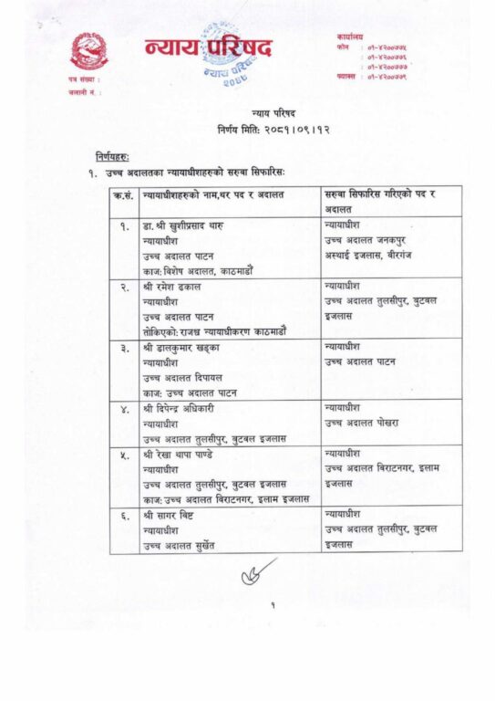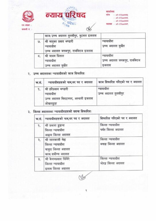 यस्तै उच्च अदालत विराटनगर अन्तर्गतको अस्थायी इजलास ओखढुंगामा कार्यरत हरिप्रसाद भण्डारी उच्च अदालत तुलसीपुरमा सरुवा भएको छ ।
