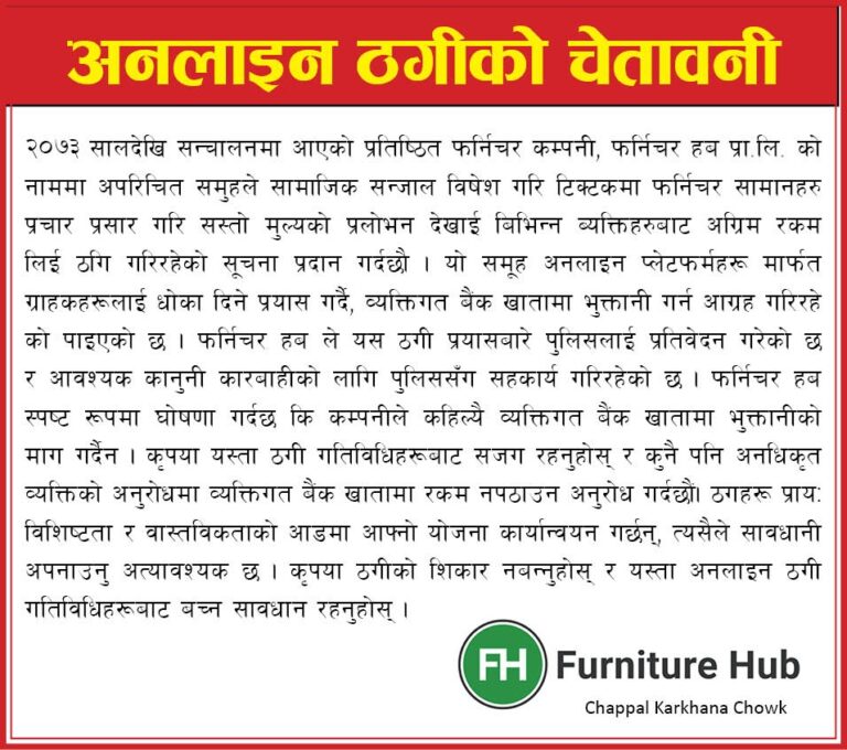 फर्निचर हब स्पष्ट रूपमा घोषणा गर्दछ कि कम्पनीले कहिल्यै व्यक्तिगत बैंक खातामा भुक्तानीको माग गर्दैन। कृपया यस्ता ठगी गतिविधिहरूबाट सजग रहनुहोस् र कुनै पनि अनधिकृत व्यक्तिको अनुरोधमा व्यक्तिगत बैंक खातामा रकम नपठाउन अनुरोध गर्दछौं। ठगहरू प्राय: विशिष्टता र वास्तविकताको आडमा आफ्नो योजना कार्यान्वयन गर्छन्, त्यसैले सावधानी अपनाउनु अत्यावश्यक छ। कृपया ठगीको शिकार नबन्नुहोस् र यस्ता अनलाइन ठगी गतिविधिहरूबाट बच्न सावधान रहनुहोस्।
