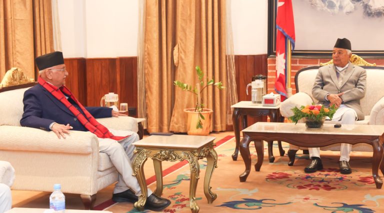 काठमाडौं— राष्ट्रपति रामचन्द्र पौडलसँग प्रधानमन्त्री केपी शर्मा ओलीले भेट गरेका छन् । राष्ट्रपति भवन शीतलनिवासमा भएको सो भेटमा उनीहरूबीच मुलुकको समसामयिक विषयमा छलफल भएको प्रधानमन्त्रीको सचिवालयले जनाएको छ । भेटमा कानुन न्याय तथा संसदीय मामिलामन्त्री अजयकुमार चौरसिया, नेपाल सरकारका मुख्यसचिव एकनारायण अर्याललगायत सहभागी थिए ।