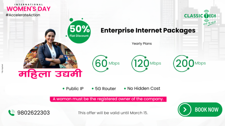 काठमाडौँ । देशकै अग्रणी तथा ठुलो इन्टरनेट नेटवर्क सेवाप्रदायक कम्पनी क्लासिकटेकले अन्तर्राष्ट्रिय नारी दिवस २०२५ को अवसरमा उधामी महिलाहरुको लागि ५०% फ्ल्याट डिस्काउन्ट मा उधामी प्याकेज अफर सार्वजनिक गरेको छ।
