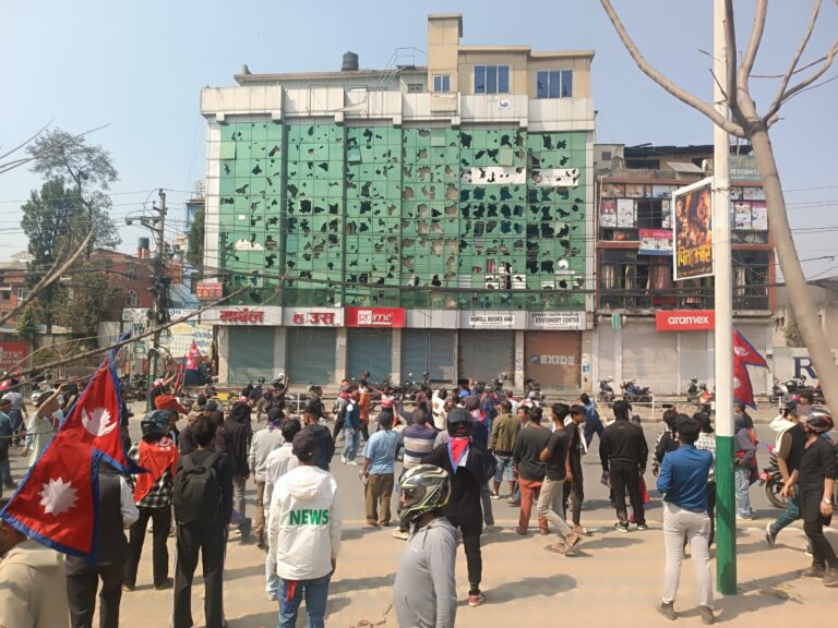 काठमाडौं—काठमाडौंको तीनकुनेमा राजावादीहरूले व्यक्तिका घरको सिसा छियाछिया हुनेगरी फुटाएका छन् । राजसंस्था पुनस्थापनासहितको माग गरेका राजावादी प्रदर्शनकारीहरूले ढुंगा प्रहार गरेर घरका सिसा फुटाएका हुन् । अहिले पनि त्यहाँ प्रदर्शनकारीले ढुंगा प्रहार गरिरहेका छन् । उक्त घरभित्र मानिसहरू छन् । छतबाट मानिसहरूले प्रहरी नभएको इसारा हातले गरिरहेका छन् ।