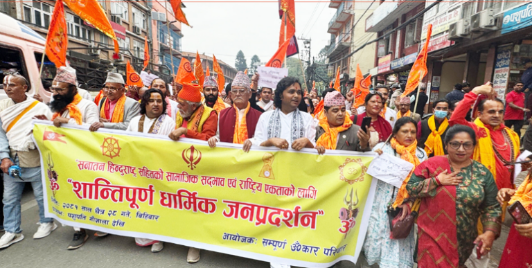 काठमाडौं—नेपालमा हिन्दुराष्ट्रको माग गर्दै बिहीबार ¥यालीको आयोजना गरिएको छ । सम्पूर्ण धार्मिक संघ संस्थाहरुको आयोजना तथा सम्पूर्ण ॐकार परिवारका धार्मिक संघसंस्थाहरुको सहभागितामा ‘सनातन हिन्दुराष्ट्र सहितको सामाजिक सद्भाव एवम् राष्ट्रिय एकताको लागि शान्तिपूर्ण धार्मिक जन प्रदर्शन’ कार्यक्रम आयोजना गरिएको हो ।