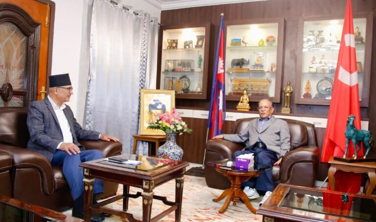 एमाले नेता तथा अर्थमन्त्री विष्णु पौडेलले प्रमुख प्रतिपक्ष दलका नेता तथा माओवादी केन्द्रका अध्यक्ष पुष्पकमल दाहाल प्रचण्डसँग भेट गरेका छन् । मंगलबार बिहान प्रचण्ड निवासमा पुगेर भेटवार्ता गरेको अर्थमन्त्रीको सचिवालयले जानकारी गराएको छ ।