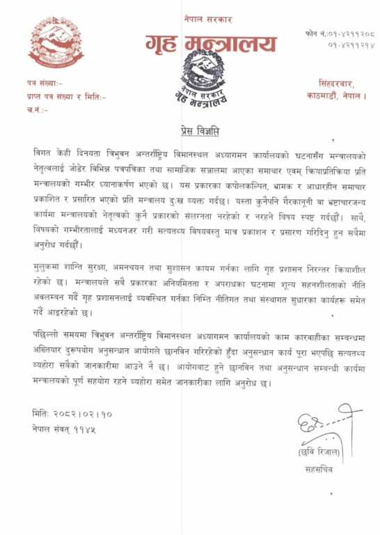 गृह मन्त्रालयका सहसचिव छवि रिजालले शनिबार विज्ञप्ति जारी गर्दै विगत केही दिनयता त्रिभुवन अन्तर्राष्ट्रिय विमानस्थल अध्यागमन कार्यालयको घटनासँग मन्त्रालयको नेतृत्वलाई जोडेर भइरहेको प्रचारप्रति ध्यानाकर्षण भएको जनाएका हुन् ।