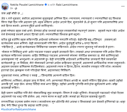 सामाजिक सञ्जाल फेसबुकमा स्टाटस लेख्दै उनले बन्दी प्रत्यक्षीकरण मुद्दाको सुनुवाइका क्रममा सर्वोच्चले न्याय नदिएको टिप्पणी गरेकी हुन् । ‘अदालतले न्याय त दिएन, दिएन, मानवीय व्यवहार पनि गरेन,’ उनले लेखेकी छन् ।