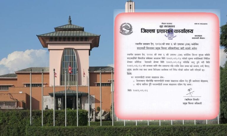 काठमाडौँ । जिल्ला प्रशासन कार्यालय काठमाडौँका प्रमुख जिल्ला अधिकारी (सीडीओ) ले दरबारमार्ग क्षेत्रमा निषेधाज्ञा जारी गरेका छन् ।