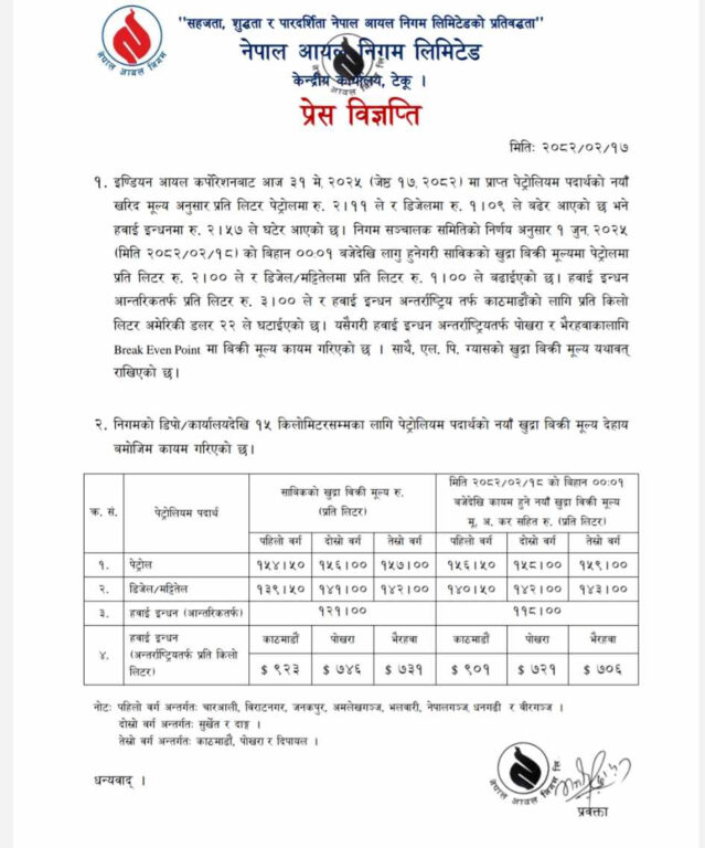 निगमका अनुसार भारतबाट पेट्रोलमा २ रुपैयाँ ११ पैसा र डिजेलमा १ रुपैयाँ ९ पैसा मूल्य बढेर आएको छ । नयाँ मूल्यअनुसार काठमाडौं उपत्यकामा पेट्रोल १५९ र डिजेल तथा मट्टीतेल १४३ रुपैयाँ प्रतिलिटर पुगेको छ ।
