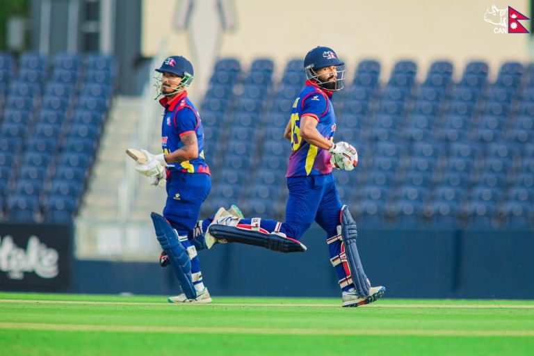 नेपालका भीम सार्कीले सर्वाधिक ७३ रन बनाउँदा सोमपालले ६७ र दिपेन्द्रले ५६ रन बनाए । स्कटल्याण्डका म्याकेन्जी जोन्सले ३ तथा शफिया शरिफ र माइकल लिस्कले २–२ विकेट लिँदा ब्रान्डन म्याकमुलेन र चार्ली कासेलले १–१ विकेट लिए ।