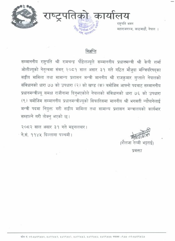 एमालेकै प्रतिनिधि सभा सांसद राजकुमार गुप्ता यसअघि संघीय मामिला तथा सामान्य प्रशासन मन्त्री थिए। गुप्ताले मंगलबार नै पदबाट राजीनामा दिएका थिए।