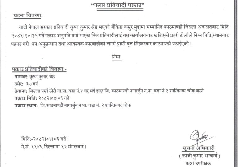३७ बर्षीय उनीविरुद्ध २०८१ माघ १५ मै काठमाडौं जिल्ला अदालतबाट पक्राउ पुर्जी जारी भएको थियो । तर हालसम्म लुकीछिपी नागार्जुन नगरपालिका वडा नं. २ शान्तिनगर चोक बस्दै आएको काठमाडौं उपत्यका अपराध अनुसन्धान कार्यालयका प्रहरी उपरीक्षक काजीकुमार आचार्यद्धारा घटना विवरणमा उल्लेख छ । उनी पर्साको ठोरी गाउँपालिका– ४ निवासी हुन् । उनका बुवा लालकुमार श्रेष्ठ एमालेबाट निर्वाचित ठोरी गाउँपालिका अध्यक्ष हुन् ।