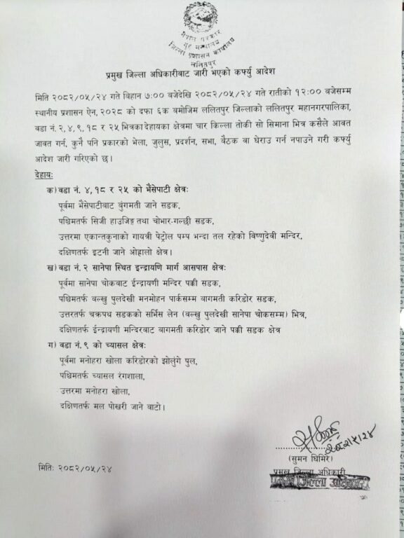 यस्तै ललितपुर जिल्लाका विभिन्न स्थानमा कर्फ्यू आदेश जारी गरिएको छ । ललितपुर महानगरपालिकाका वडा नं। ४, १८ र २५ को भैंसेपाटी क्षेत्र, वडा नं। २ स्थित सानेपा इन्द्रायणि मार्ग आसपास क्षेत्र र वडा नं। ९ को च्यासल क्षेत्रमा आज बिहान ७ बजेदेखि कर्फ्यू आदेश जारी गरिएको हो ।