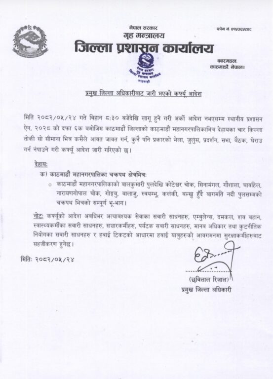हिजो जेनजी युवाको प्रदर्शनपछि लगाइएको कर्फ्यु अवधि आज बिहान ५ बजेबाट सकिएको थियो । त्यसपछि आज बिहान साढे ८ बजेदेखि अनिश्चितकालका लागि कर्फ्यु लगाइएको हो । काठमाडौं महानगरपालिकाको बालकुमारी पुलदेखि कोटेश्वर चोक, सिनामंल, गौशाला, चाबहिल, नारायणगोपाल चोक, गोंगबु, बालाजु, स्वयम्भु, कलंकी, बल्खु हुँदै बागमती नदी पुलसम्मको चक्रपथभित्रको सम्पूर्ण भूभागमा कर्फ्यु लगाइएको हो । कर्फ्यु अवधिभर अत्यावश्यक सेवाका सवारी साधनहरुबाहेक अन्यलाई आउजाउ गर्न, सभा जुलुस गर्न वा कुनै पनि प्रकारको प्रदर्शन गर्न रोक लगाइएको छ ।
