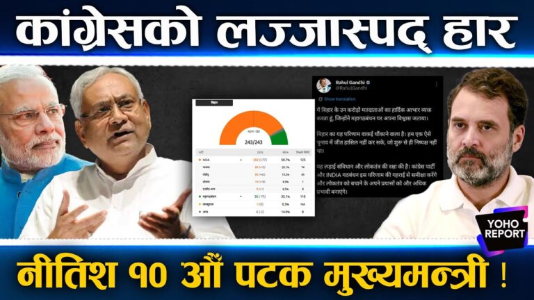 काठमाडौँ । बिहारको विधानसभा निर्वाचनमा प्रधानमनत्री नरेन्द्र मोदी नेतृत्वको भाजपा सामेल एनडीए गठबन्धनले निर्णायक जित निकालेका छन् । २०२ सिट सहित दुुई तिहाई बहुमतका साथ एनडीए विजयी हुँदा कांग्रेसले भने लज्जास्पद हार ब्योहर्नुप¥यो ।