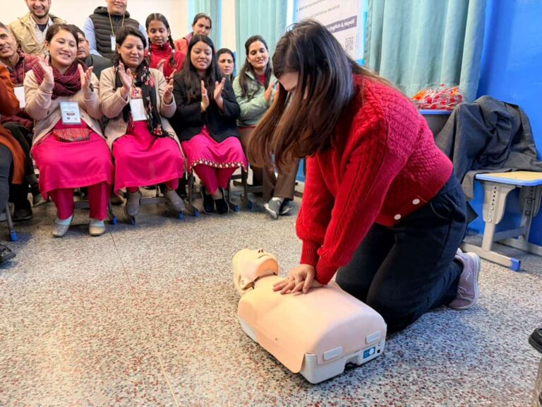 Following the launch, 40 teachers and students took part in hands-on CPR and choking first aid sessions. “After cardiac arrest or a choking event, quick action saves lives. We’ve been training police and other responders across Nepal, and now we will work with schools as well,” said Dr. Kamal Thapa, Emergency Medicine Physician and Executive Lead of HAPSA Nepal’s CPR Program, who led the training program today.