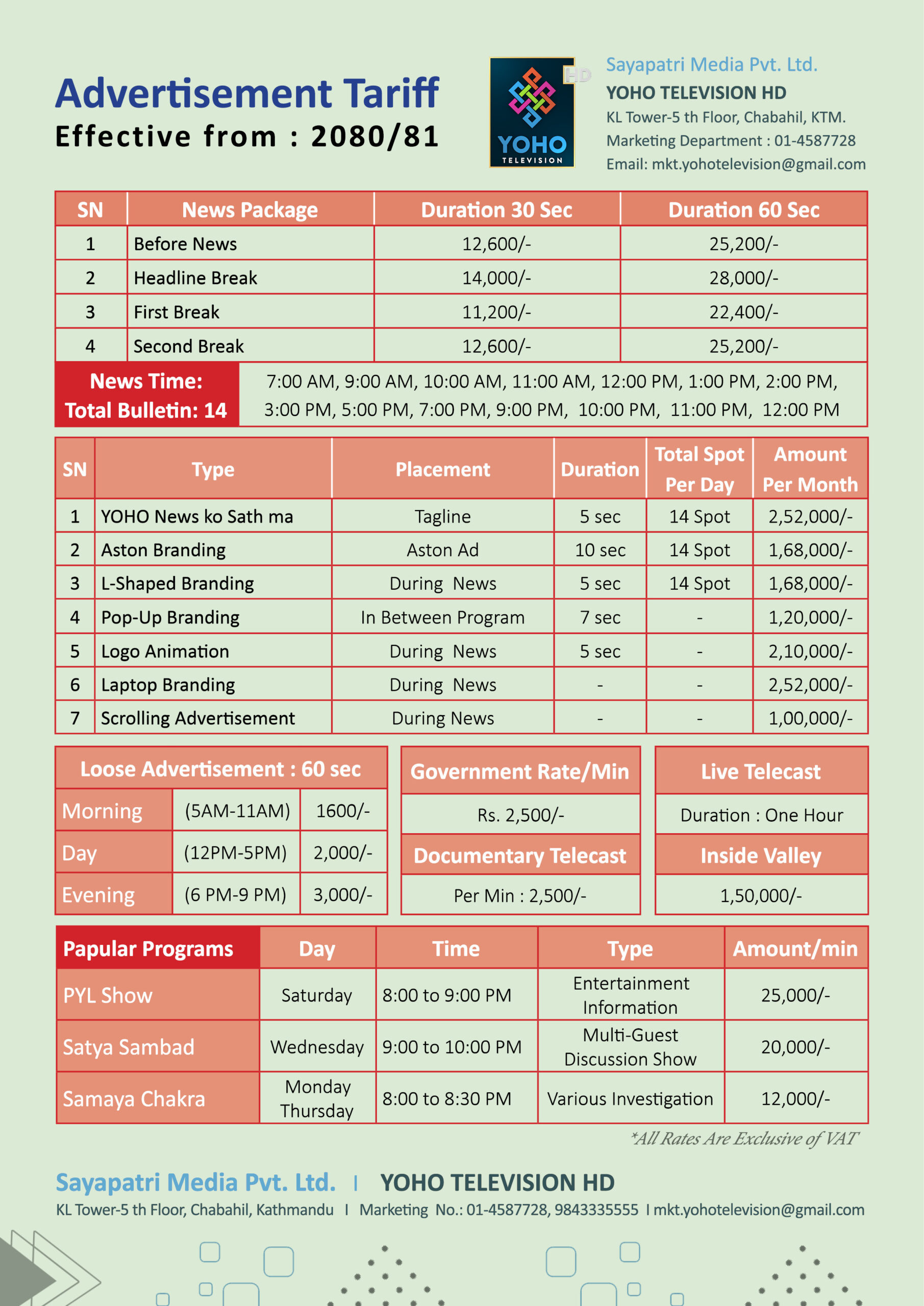 It is our immense pleasure TV to introduce HD to the distinct television channel “YOHO Television HD”. It is the 5th HD Satellite Television channel in Nepal operated under “Sayapatri Media Pvt. Ltd.
