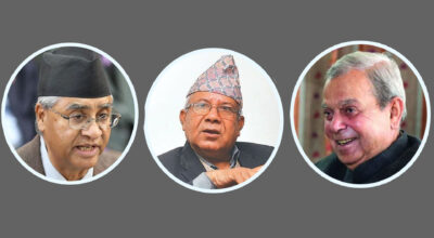 काठमाडौँ— ओली, रास्वपाका सभापति रवि लामिछाने र राप्रपाका अध्यक्ष तथा उपप्रधान एवम् ऊर्जामन्त्री राजेन्द्र लिङ्देनसमेतको