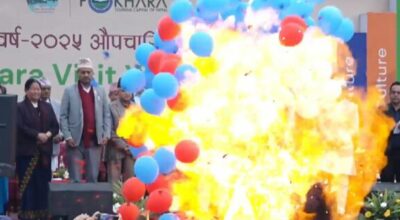 पोखरा भ्रमण वर्षको उद्घाटनमा बेलुन पड्केर अर्थमन्त्री पौडेल र मेयर घाइते