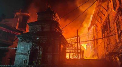 काष्ठमण्डप नजिकै बिहान साढे ४ बजेदेखि लागेको आगो अझै नियन्त्रणमा आउन सकेन